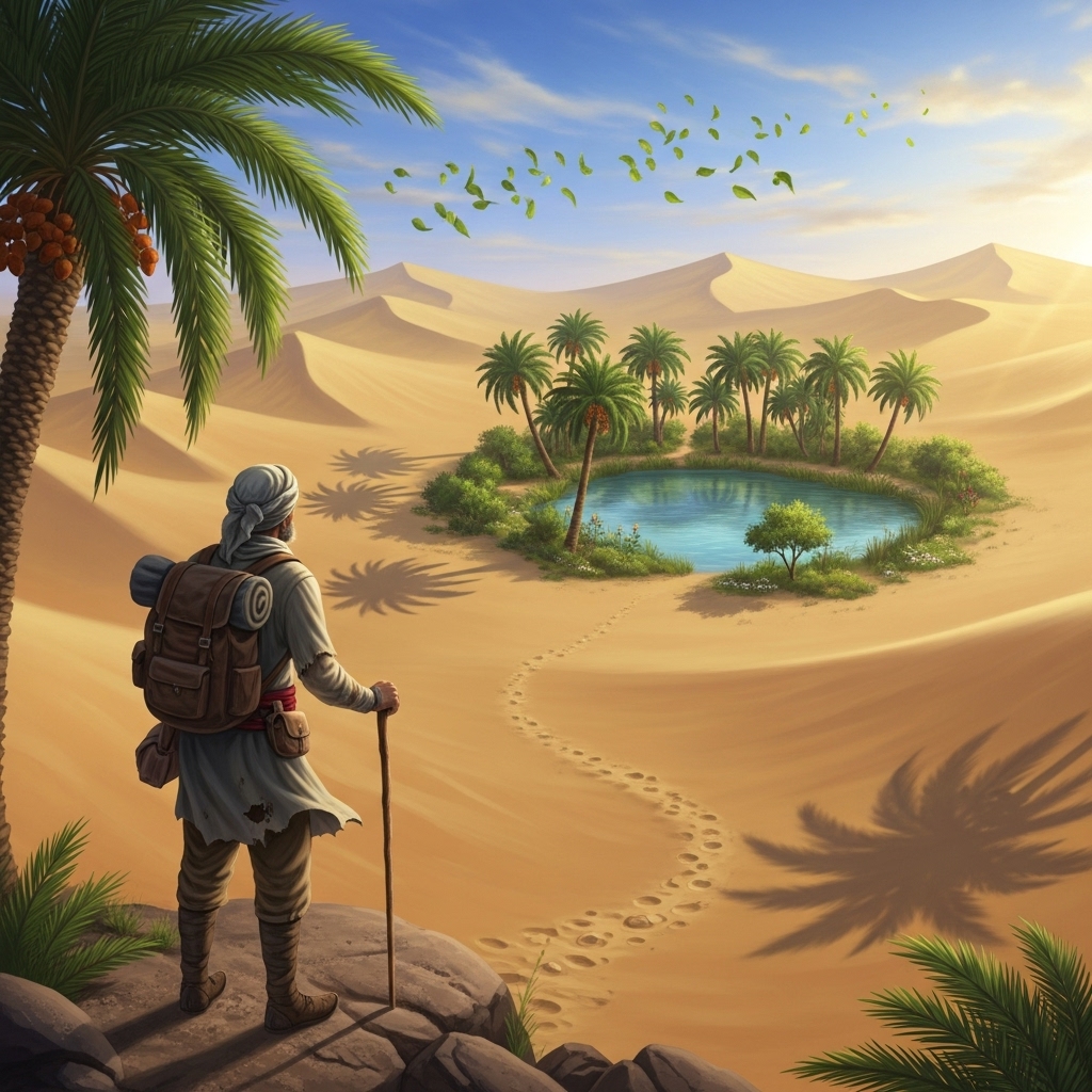 Tam o anda, bir serap gördü. Yok, bu bir serap olamazdı. Bir vaha! Yeşil bir palmiye ağacı ve altında pırıl pırıl bir su birikintisi. Zorlukla ayağa kalktı ve oraya doğru yürüdü. Vahaya ulaştığında, suyun içine ellerini daldırdı. Hayatında içtiği en güzel suydu. O ağacın altında uykuya daldı.